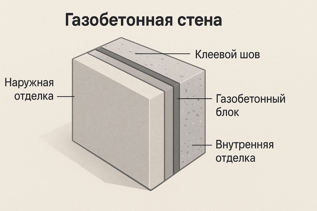 Газобетонные стены возводятся из крупноформатных блоков, которые укладываются на специальный клей. Материал имеет пористую структуру, благодаря чему обладает низкой теплопроводностью. Стена из газобетона — это монолитная конструкция, которая после возведения требует только финишной отделки.