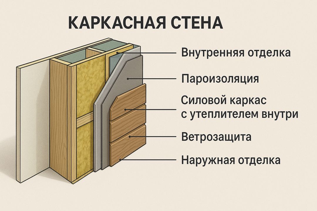 Каркасная технология базируется на создании несущего деревянного или металлического каркаса, который затем заполняется утеплителем и обшивается листовыми материалами. Стены получаются многослойными: внутренняя обшивка, пароизоляция, утеплитель, ветрозащита и наружная отделка.