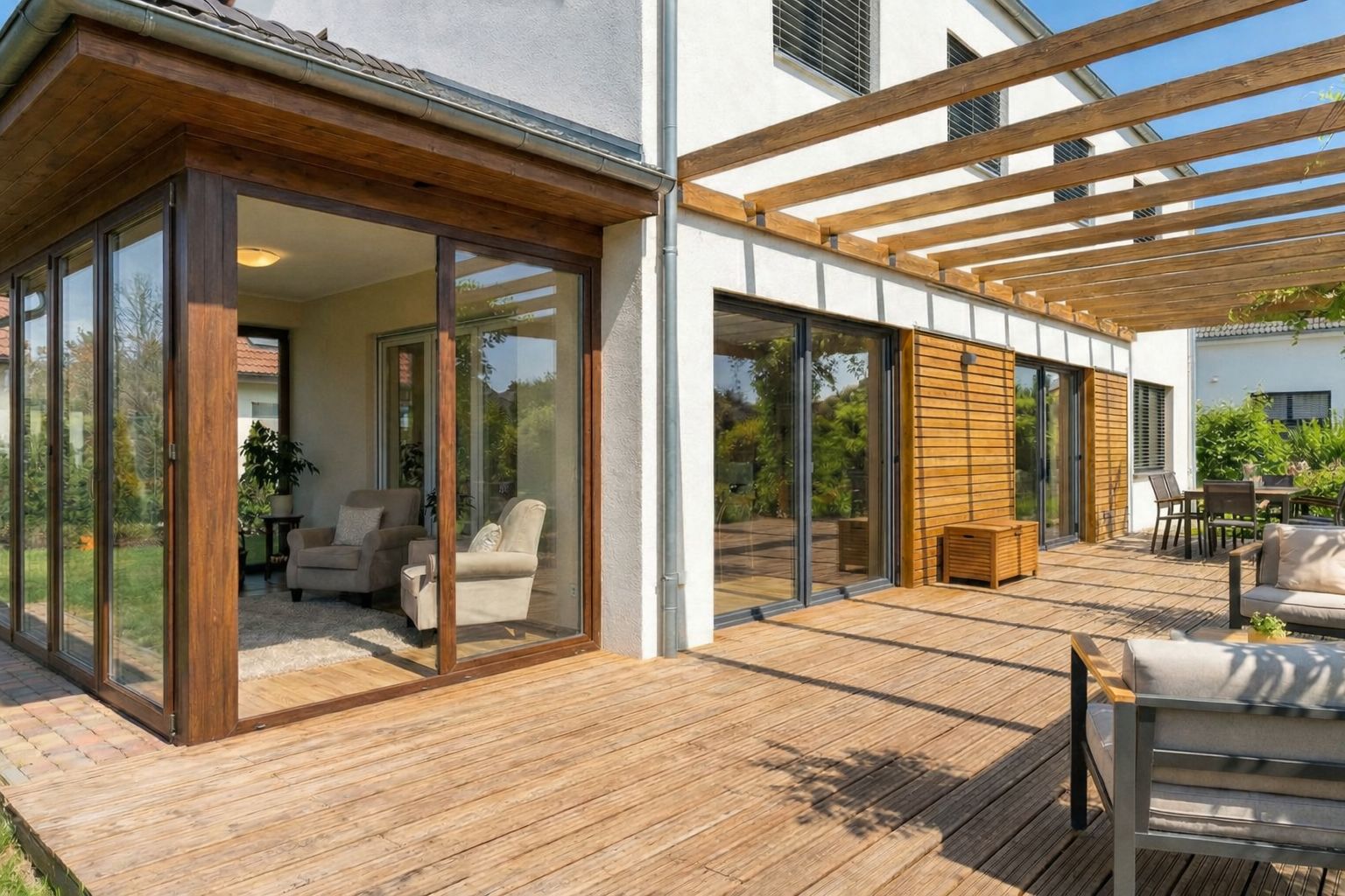 Объединение веранды и террасы — гибкое решение для тех, кто хочет комфорт в любую погоду. Веранда служит закрытой зоной отдыха, а терраса остаётся открытой площадкой.